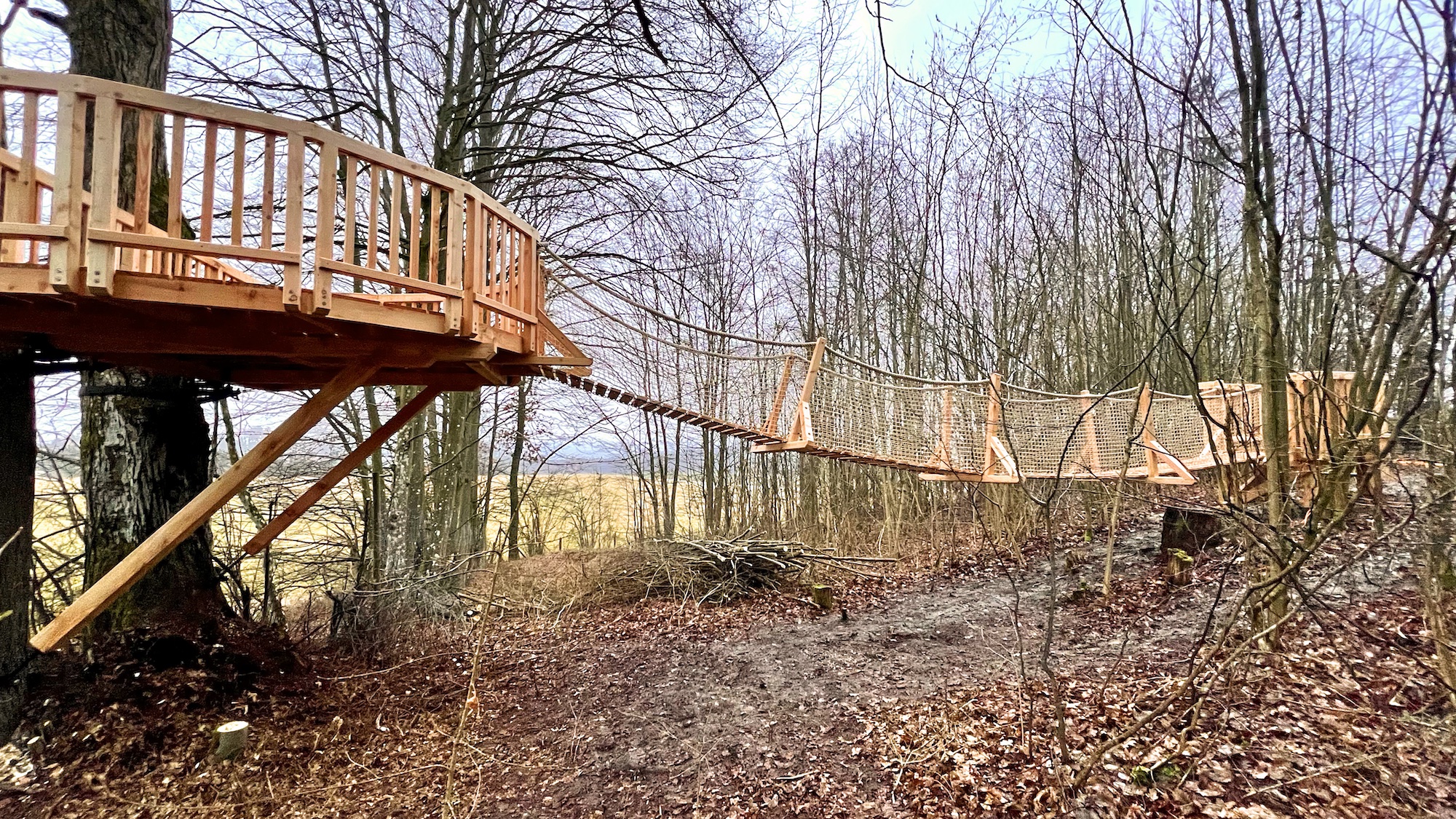 Diese Plattform findet man nicht zufällig. Drei kleine Stufen führen vom Grundstück in ein Dickicht aus jungen Baumtrieben, Laub und Licht. Dort beginnt die Hängebrücke – neun Meter schwebendes Holz zwischen Grün und Stille. Auf drei Metern Höhe trägt sie einen hinüber, weg vom Alltag, hin zu einem Ort, der einfach nur eines ist: da.