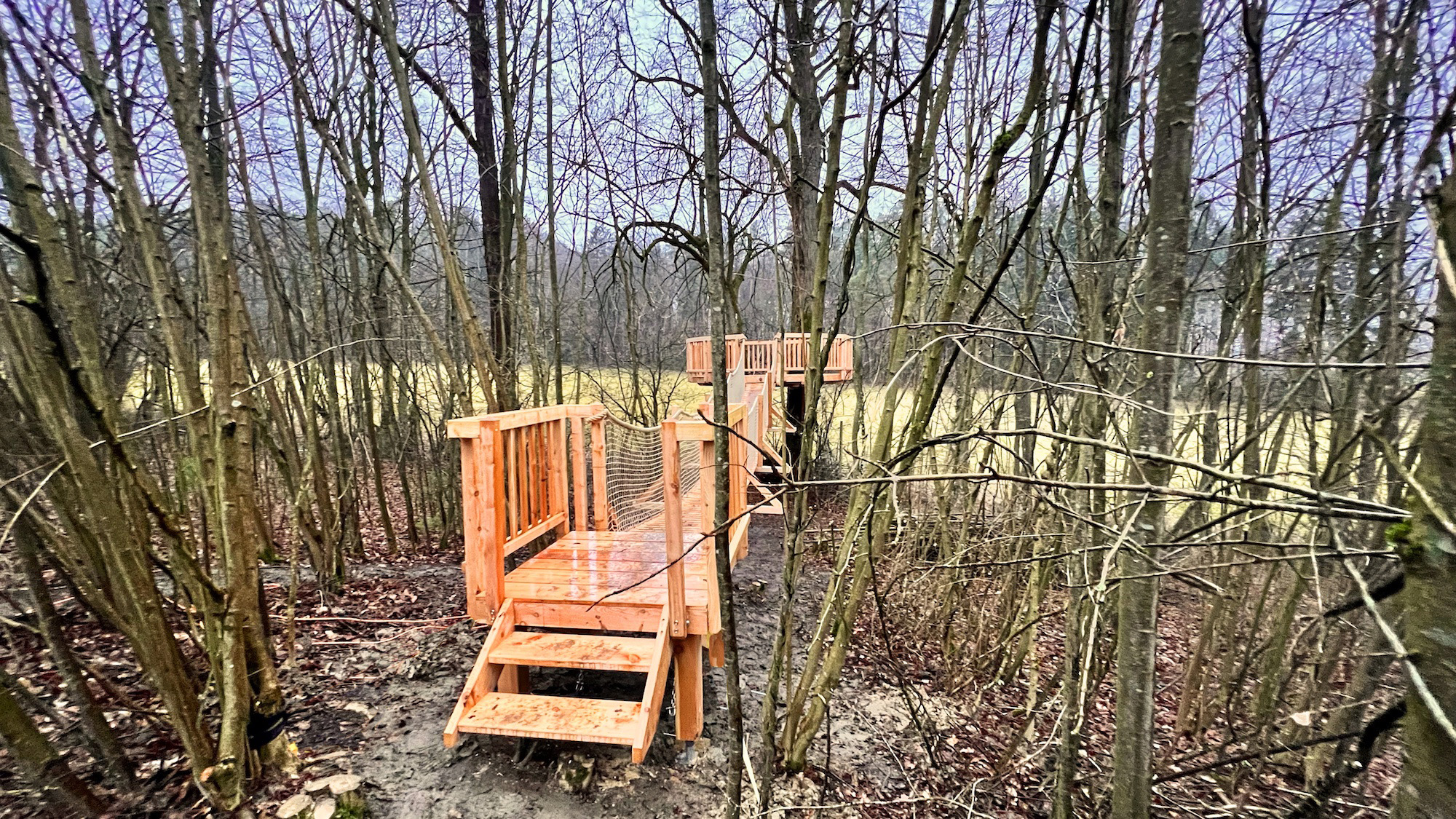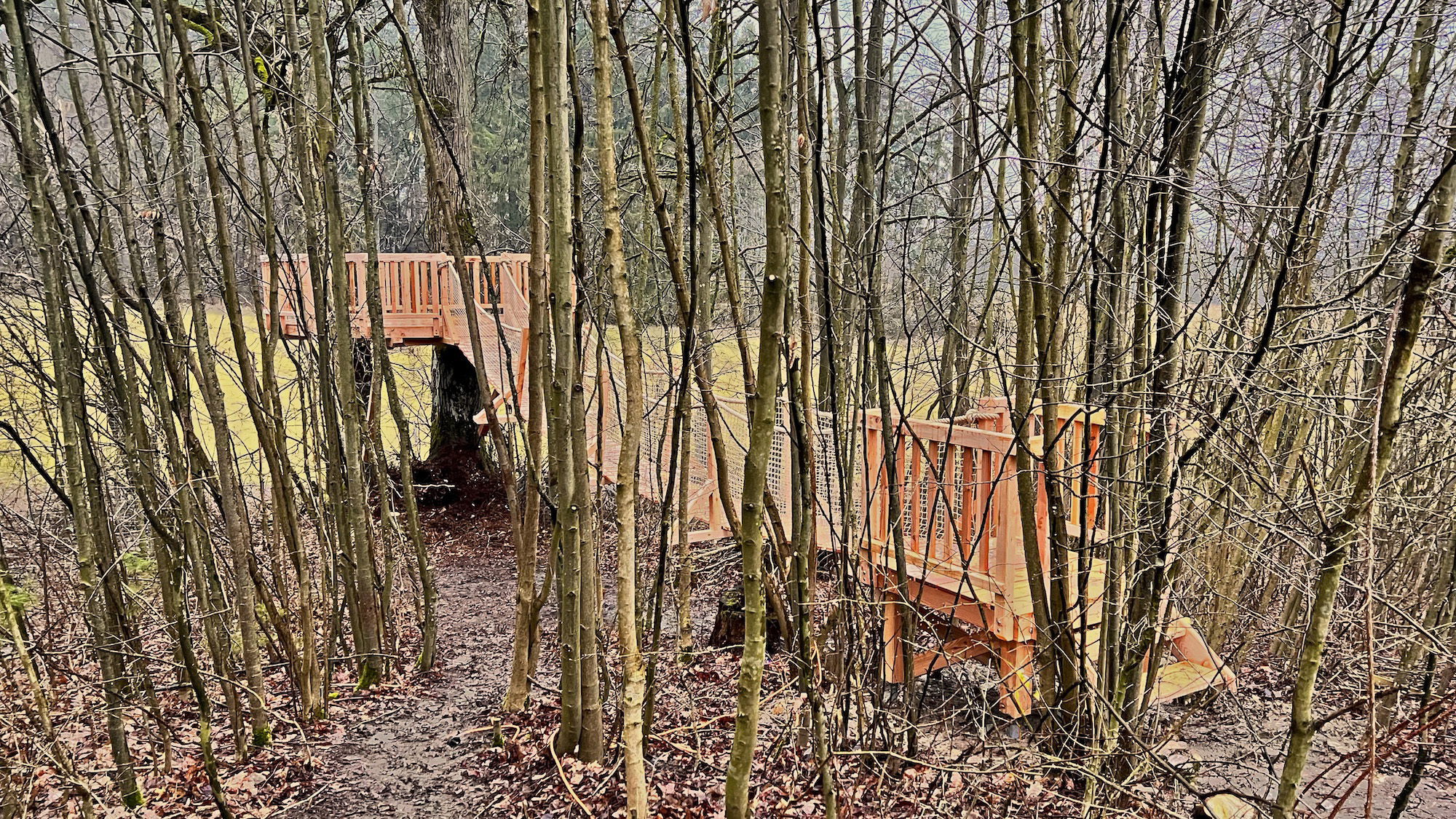 Diese Plattform findet man nicht zufällig. Drei kleine Stufen führen vom Grundstück in ein Dickicht aus jungen Baumtrieben, Laub und Licht. Dort beginnt die Hängebrücke – neun Meter schwebendes Holz zwischen Grün und Stille. Auf drei Metern Höhe trägt sie einen hinüber, weg vom Alltag, hin zu einem Ort, der einfach nur eines ist: da.